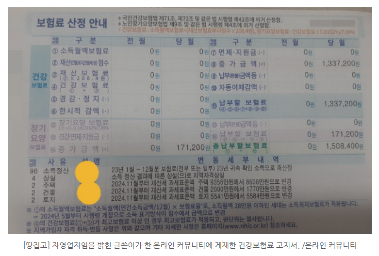 한 커뮤니티에 올라온 글입니다. 11월분 건강보혐료 고지서가 평소 내던 금액보다 15배인 150만원을 내라고 왔는데, 도대체 원인이 무엇일까요?
