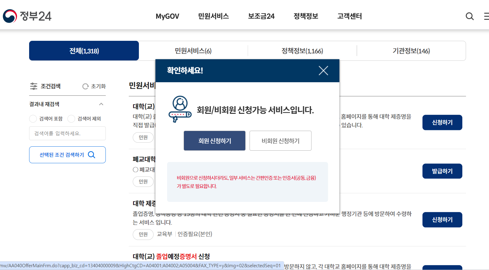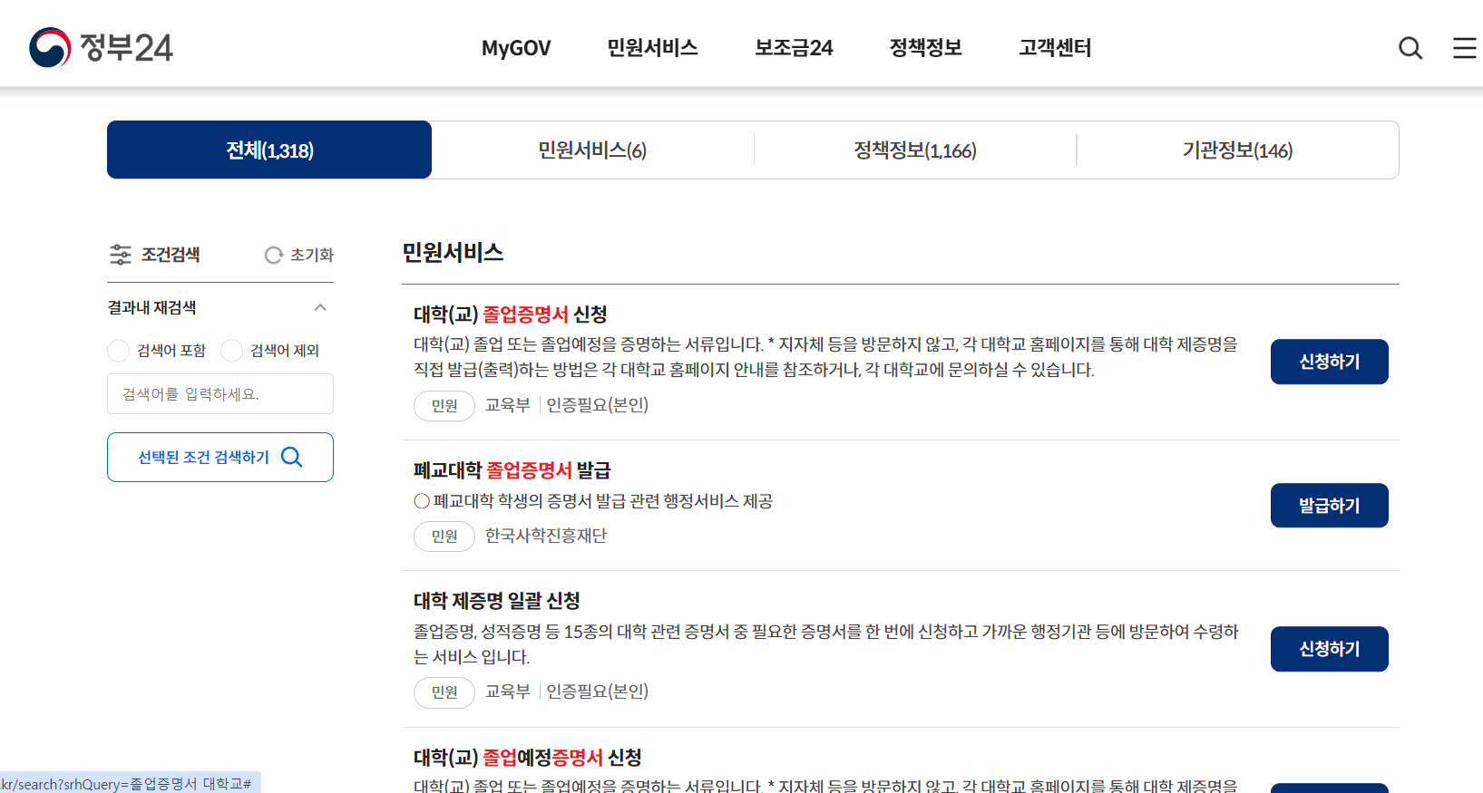 정부 24를 검색해서 홈페이지에서 대학교 졸업증명서를 검색합니다.