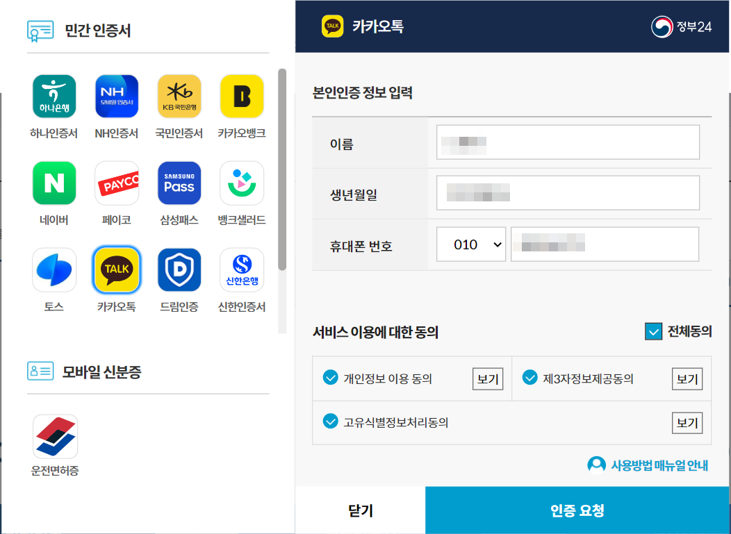 핸드폰에 카톡으로 온 인증서로 인증합니다.