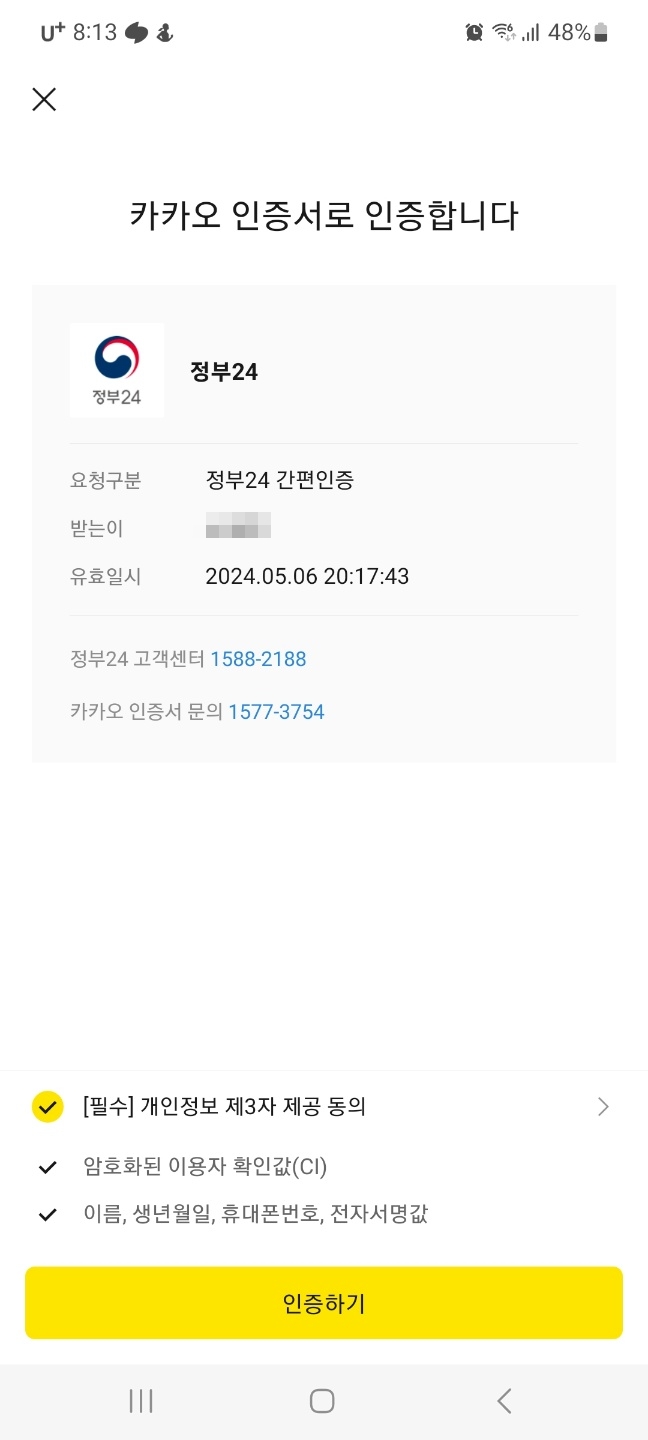 핸드폰에 카톡으로 온 인증서로 인증합니다.