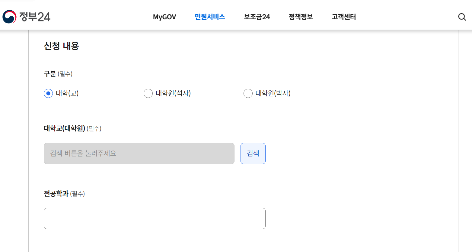 대학교 대학원(석사), , 대학원(박사) 중 선택하고, 본인의 대학교와 전공학과를 검색해서 선택해줍니다.