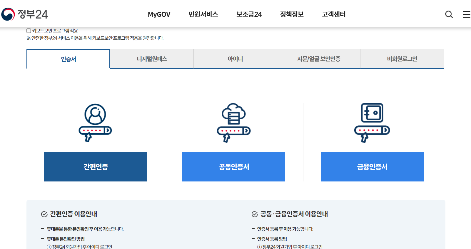 으로 신청합니다. 간평인증이나 금융인증서 등으로 로그인합니다.